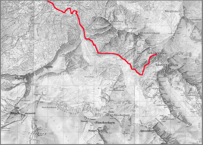 Von Grindelwald zur Schreckhornhütte. Dann auf den Schreckfirn über Rampe zum Südwestgrat und auf den Gipfel.
