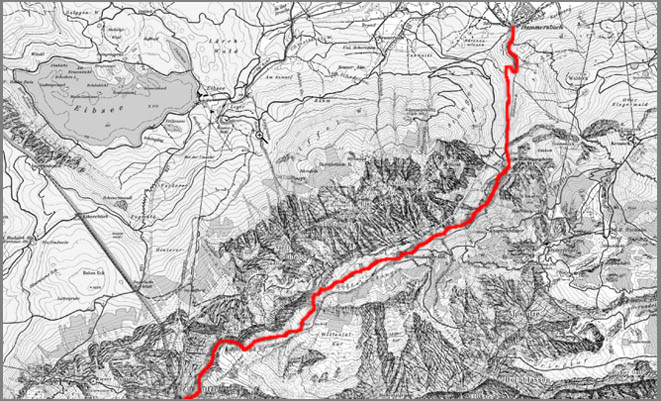 Von Hammersbach durch das Höllental. Dann zum Zugspitzferner hinauf und über den Klettersteig zu Gipfel.