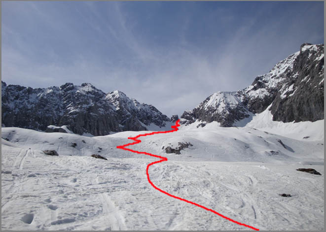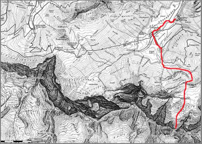 Vom Alpengasthof Eng zu den Engalmen und dann hinauf durch das Hochglückkar in die Hochglückscharte.