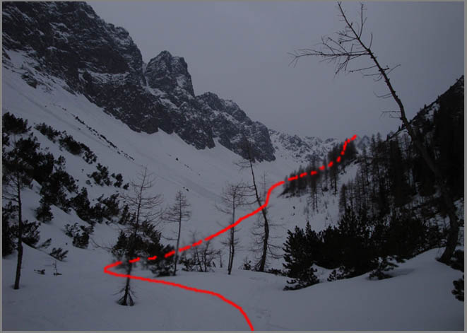 in das Kar nach Südwestenen. Ganz hinten durch eine steile Rinne