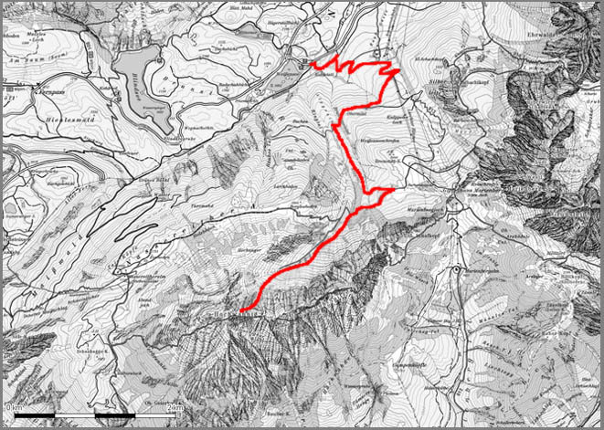 Richtung Mittelbergalm. An der Baumgrenze in das Kar nach