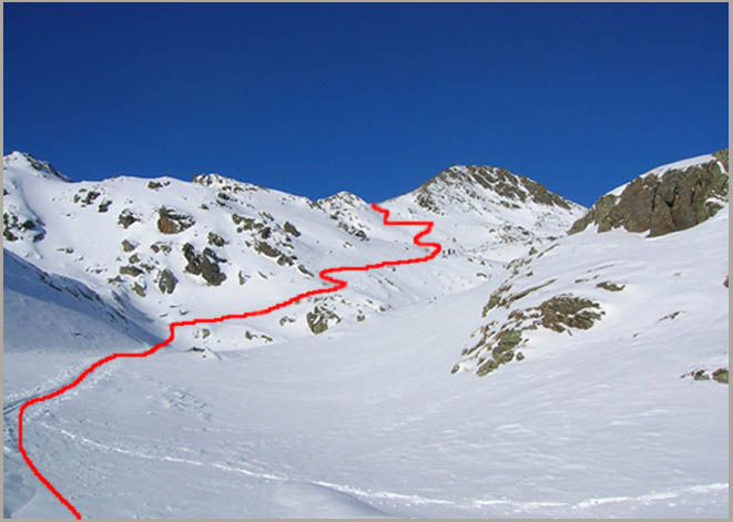 Schöne flache ostseitige Hangrichtung, ab dem Joch zu Fuß zum Gipfel.
