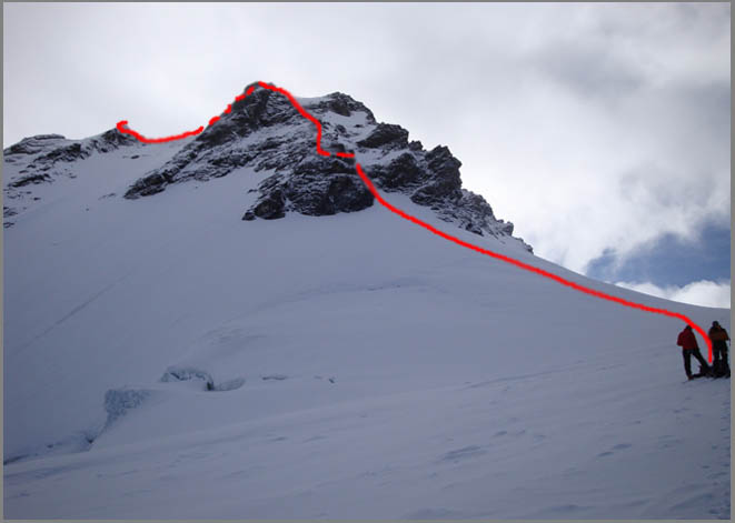 zum Vorgipfel folgen. Hauptgipfel über Schneegrat.