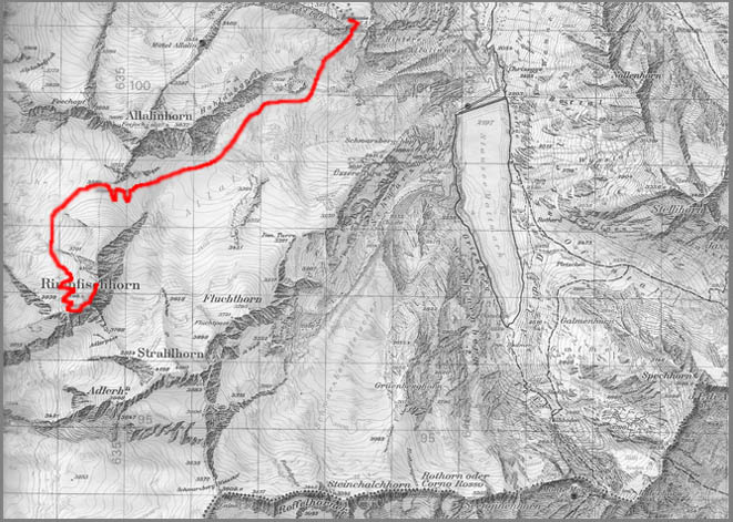 Rimpfischhorn westlich umgehen und in Rimpfischsattel steigen.