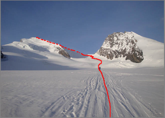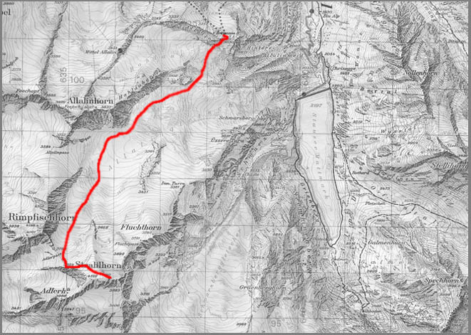 Von der Britanniahütte auf den Allalingletscher, von dort erst Richtung Allalinpass, dann Adlerpass. Über Westgrat un Flanke zum Gipfel.